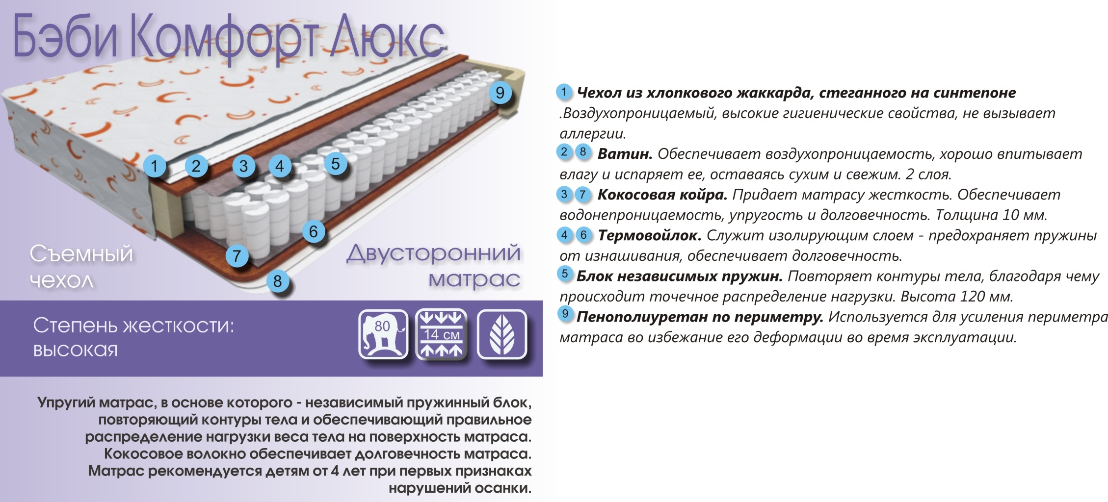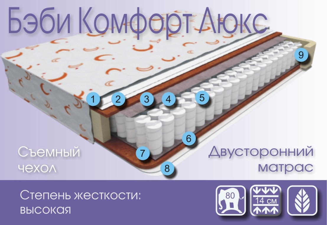Бэби Комфорт Люкс - жесткость выше средней. Упругий матрас, в основе которого - независимый пружинный блок, повторяющий контуры тела и обеспечивающий правильное распределение нагрузки веса тела на поверхность матраса. Кокосовое волокно обеспечивает долговечность матраса. Матрас рекомендуется детям от 4 лет при первых признаках нарушения осанки.